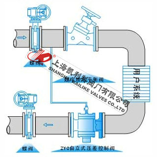 4、便流量的水平之平、干管入口處以及在安裝溫控閥、調(diào)節(jié)閥等的動(dòng)態(tài)系統(tǒng)的支、干管入口處、安裝自立式壓差控制閥可使被控系統(tǒng)、回水管之間的壓差保持恒定值。