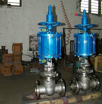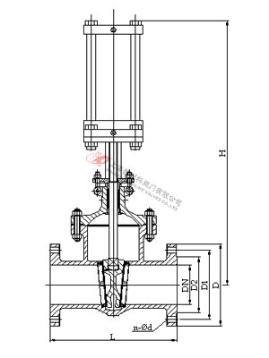 1、本閥主要由閥體、閥蓋、閘板、閥桿、密封圈、雙層氣缸及其活塞、活塞桿、隔板連同緩沖機構(gòu)、手動機構(gòu)、氣動-手動轉(zhuǎn)換裝置和閥蓋填料裝置等部分組成。