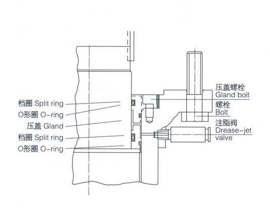 填料壓蓋部密封如圖所示采用了四個(gè)O型圈和密封注脂裝置。